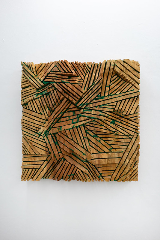 The work reveals the artist’s manual gesture and transforms wood into a visual language that speaks of time, process, and construction.