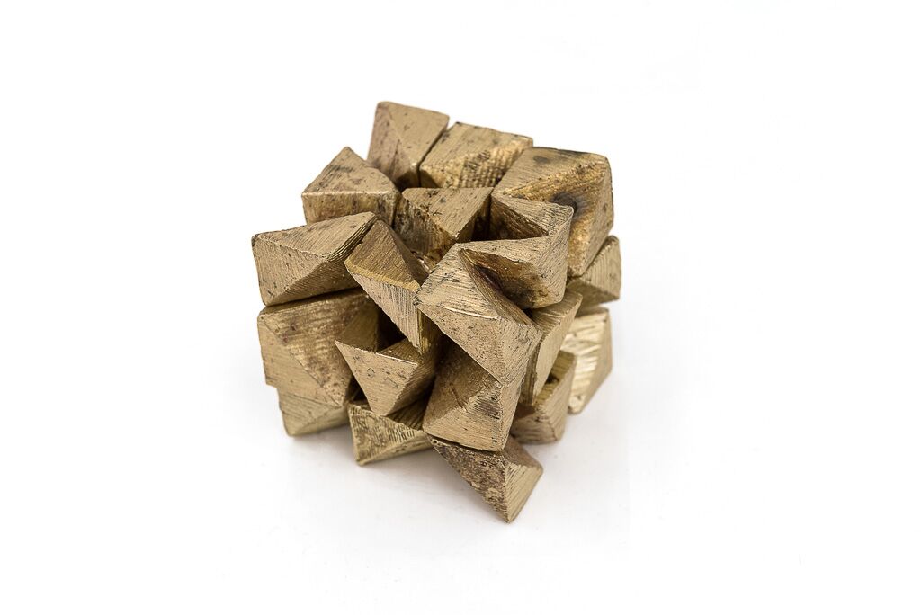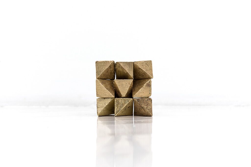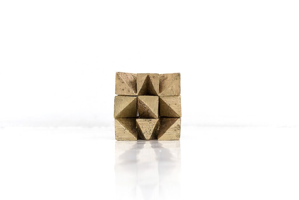 El 1972, Carl Andre hizo una pieza titulada Trabum, la cual consiste en un cubo formado por nueve secciones rectangulares encimadas de tres en tres de forma que generan un cubo perfecto. Mi pieza hace referente a la de Carl Andre en su método constructivo, pero tiene secciones talladas que generan diversas lecturas cuando el cubo se arma de formas diferentes.