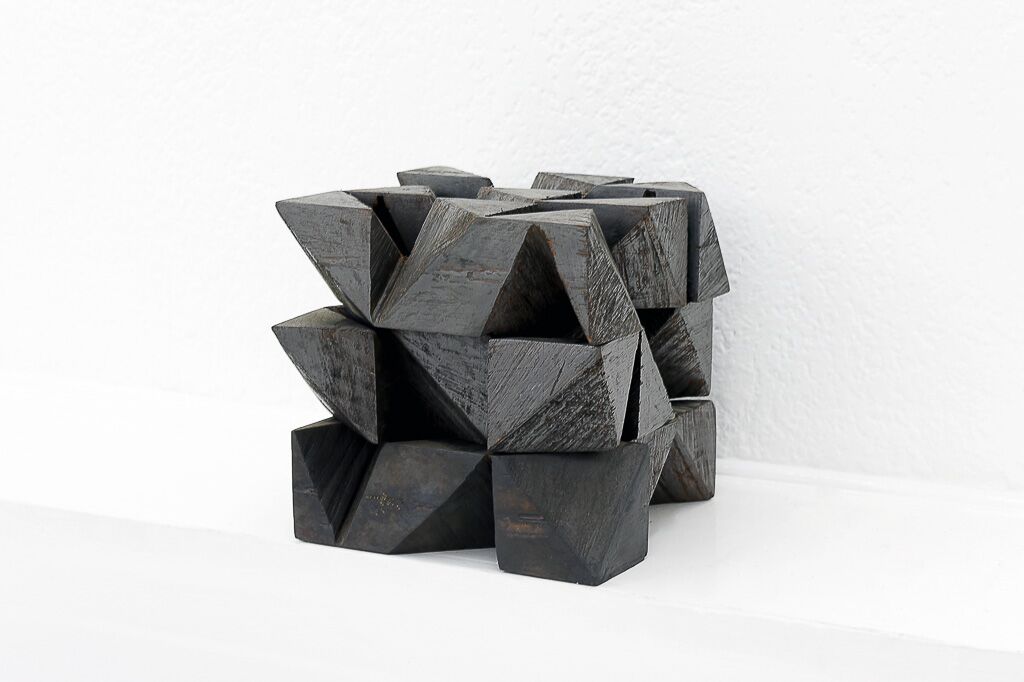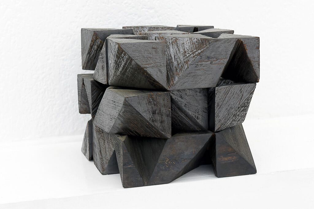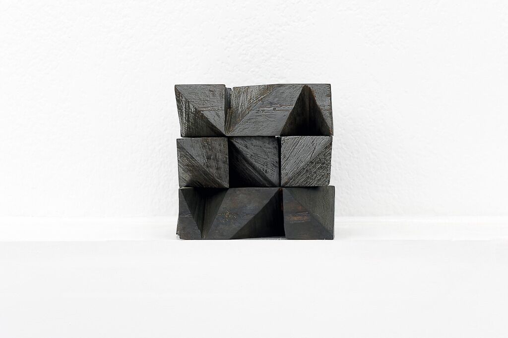 El 1972, Carl Andre hizo una pieza titulada Trabum, la cual consiste en un cubo formado por nueve secciones rectangulares encimadas de tres en tres de forma que generan un cubo perfecto. Mi pieza hace referente a la de Carl Andre en su método constructivo, pero tiene secciones talladas que generan diversas lecturas cuando el cubo se arma de formas diferentes.